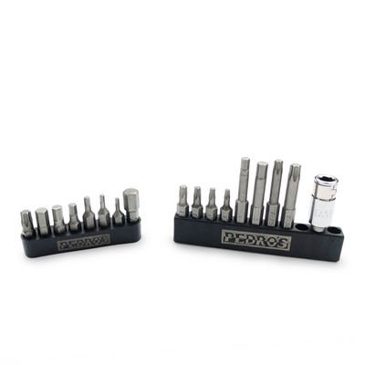Torque wrenches have become an essential bicycle tool. The increase in carbon fiber bikes and components have driven the need. While carbon fiber allows for more optimal design and provides a far higher strength to weight ratio compared to steel and aluminum, it is also more susceptible to crushing and cracking when improperly set up. Pedro's Bit Set is designed to work with our torque wrenches offering the most common sizes required. Bits made from heat-treated tool steel for strength and lasting performance, this set includes a 1/4" drive adapter, 2, 2.5, 3, 4, 5, 6, and 8mm hex bits, and T25 torx bit. Backed by a Pedro's lifetime warranty.
